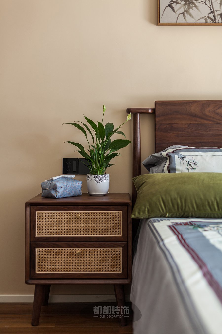卧室优雅素净,木质家具摆件、草绿色的窗帘与床品、水墨竹叶壁画,在避繁就简的设计笔触中,款款诉说着纯粹的情思,于喧嚣一隅中寻觅质朴生活之道。 淡黄色的背景墙中点缀竹墨画,给人一种寺庙般禅意的清净,石榴果实盆栽、白掌花、小多肉和琉璃灯,给刘先生一个没有束缚的独处空间。 屋外是一个生活阳台,墙面和地面也都是水磨石材质,耐晒又防水,洗衣机下定制轮板方便移动。