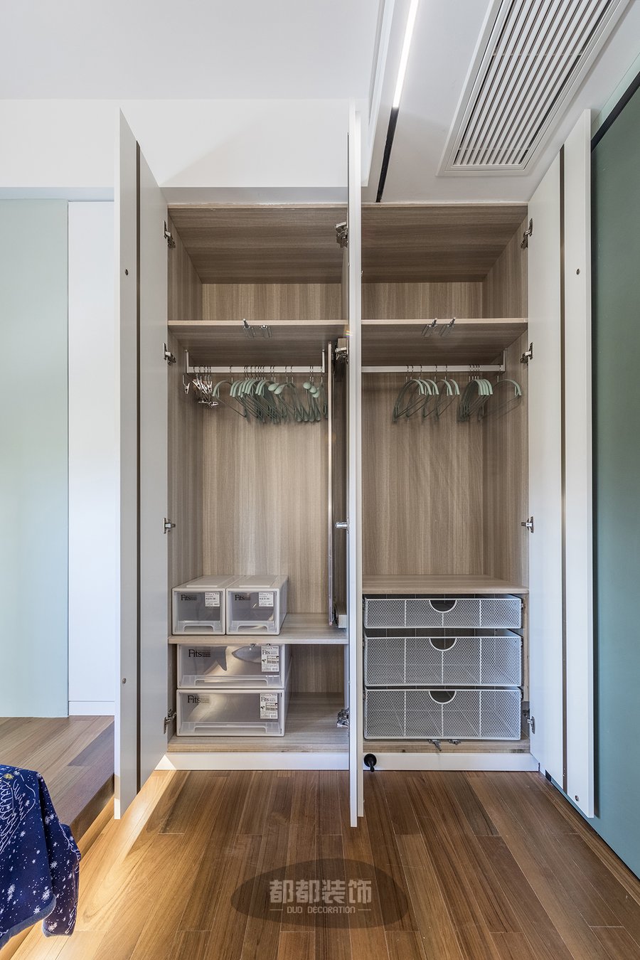儿童房的设计围绕星空蓝,淡蓝色的墙面宁静,深蓝色的床品活泼,原木桌椅为孩子打造舒适的学习空间。 学习区设计感十足,绸带造型壁灯+L型条形灯潮流时尚,铁艺洞洞板搭配小钢针挂什么都不在话在,钉上铁板又是置物架,摆个香薰或者蜡烛都很合适。 整墙的衣柜收纳力MAX,顶端放些被子枕头,中间挂平时常穿的衣服,下面放袜子、内衣拿取方便,全身镜也收纳在里面,出门前看看全身搭配,心情会好上一整天!