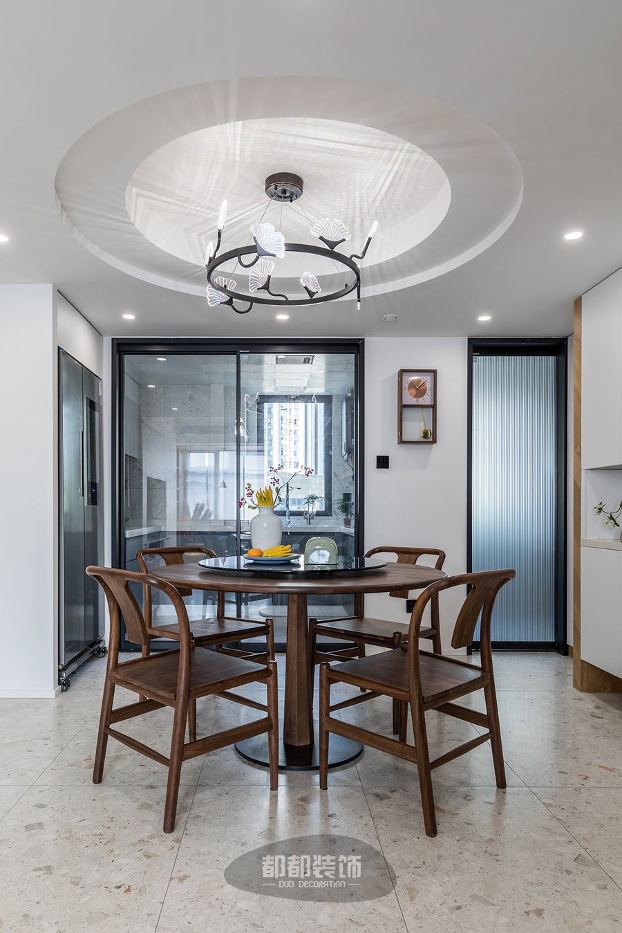 餐厅和厨房以一扇玻璃移门打破束缚与阻碍,带来空间的交流与互动,这边吃饭其乐融融,那边烟火人间,带来一种同生共融的和韵与温馨。 空间黑色的基调上,点缀以少许大理石的自然纹理,再辅以精致的水晶吊灯,让生活回归最纯粹的状态,灯火摇曳间,让家的温馨驻留心间。 餐厅木质餐桌椅与客厅家居相呼应,胡桃木材质沉稳古典,大气端庄的中式美呼之欲出,白色顶天式餐边柜就像天然的幕布,将桌面上佛手、花束衬托的更加艳丽。