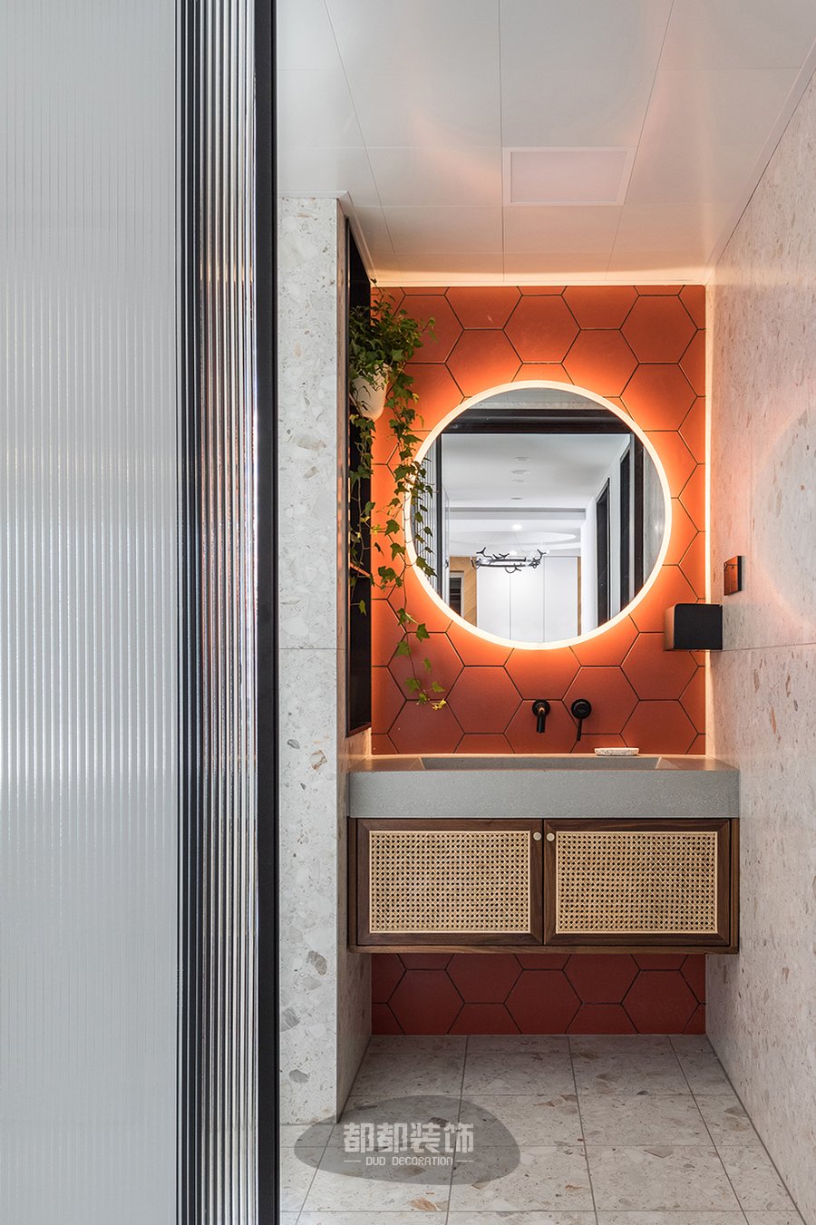 卫浴干湿分离,干区外是长虹玻璃门,推开门映入眼帘的爱马仕橙以灯光点缀,六边形小砖铺设浴室墙与洗漱台,垂挂的常春藤、亚光黑色水龙头,处处都能感受到浪漫主义的影响。 北欧风总是自带一股粗犷的温馨感,摒弃了常用的白色,粗糙质感的地板+蜂窝型橘色墙面,视觉效果绝美。 三分离浴室,洗手台外移,兼顾洗漱、沐浴和如厕三大方面,让吊柜、壁龛、台面最大化的利用,貌美又实用。 次卧卫浴花灰色主调,原木框圆镜、做旧感洗漱台,整体小巧但一应俱全。