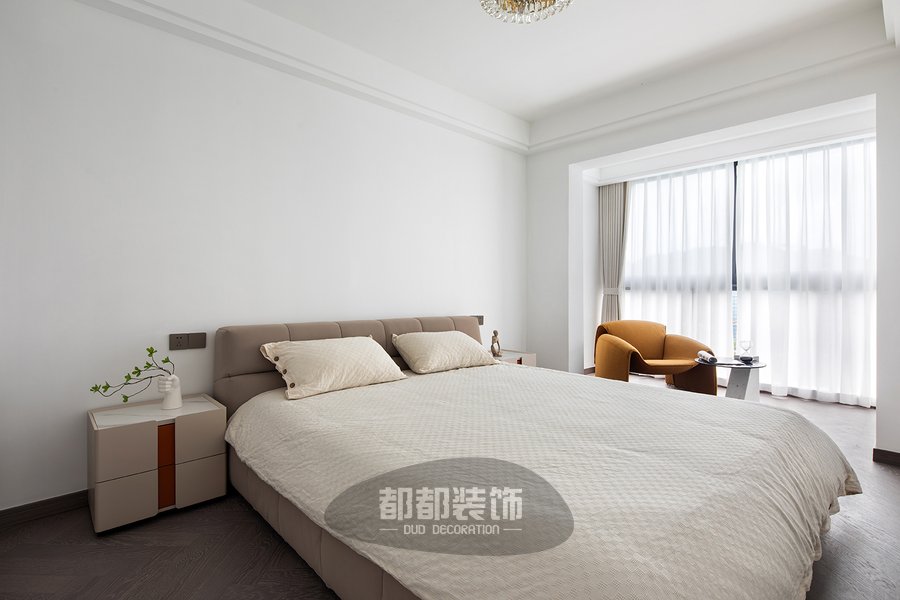 在阳光的影响下,米色的空间有着透气的呼吸感,即使是纯白的墙看起来也没有单调死板的效果。 整体墙面的大面积留白,让视觉更集中在床头这一块,浅咖色的绒布床头板厚实又舒适,环形水晶吊灯增添轻奢质感。 现在连懒人沙发都开始内卷了吗?亮棕色螃蟹椅流畅的造型和亲肤的面料,让人看到就想体验一把葛优躺的快乐!