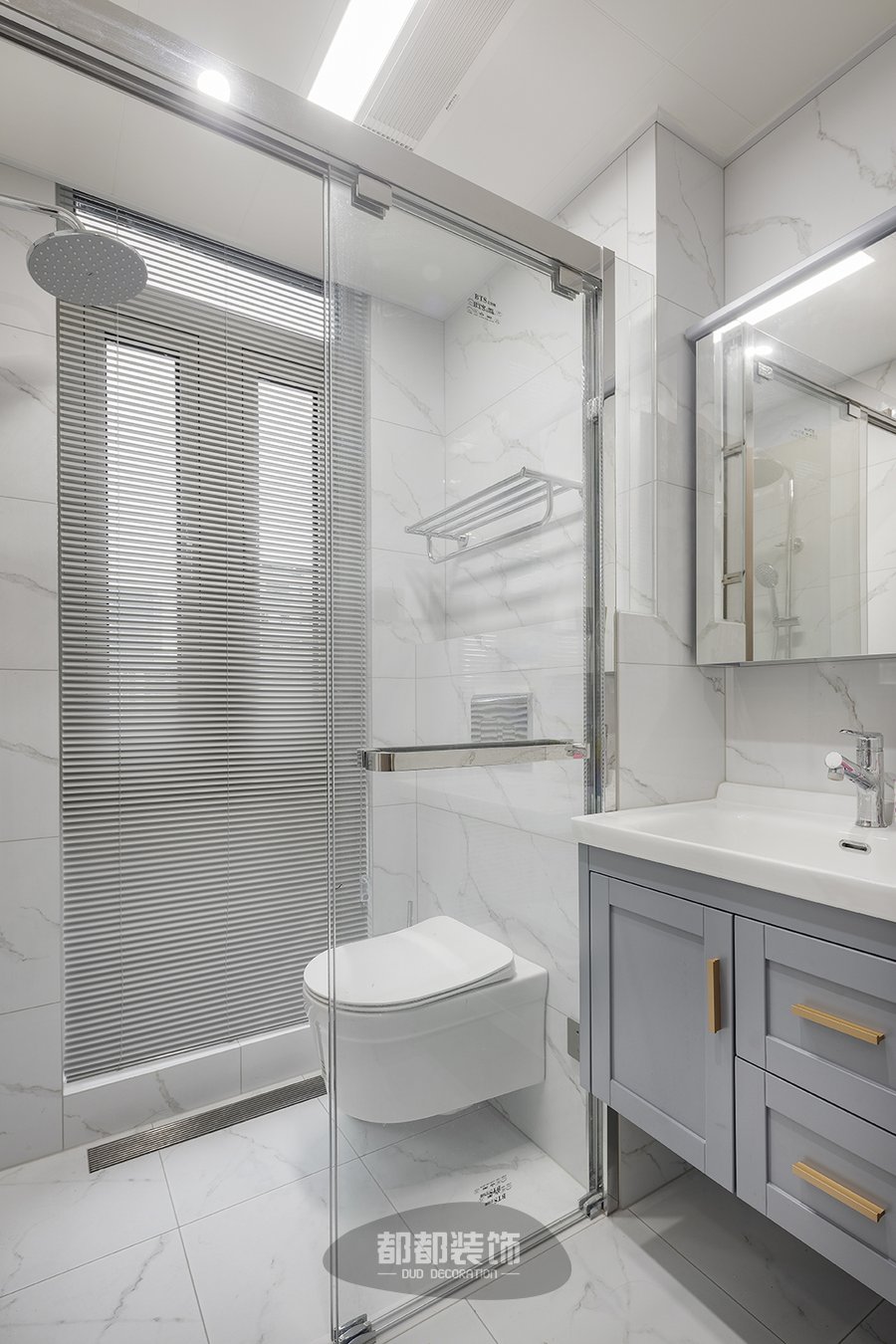 公区卫生间以浅色调为主,岩板的台盆清爽好打理,浅粉色浴柜丰富了空间色彩,结合筒灯和灯槽的灯光组合,让整个空间都得到均匀的灯光覆盖。 因为主卫较小,所以将如厕和淋浴放在了一起,马桶采用悬空式智能马桶,任何一个空间死角都不放过。