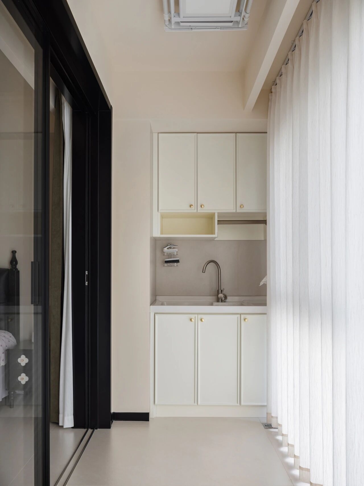 比如说有些家庭会习惯把家政工具和一些杂物放在阳台,那么阳台柜就需要做得大一些,西方留空方便扫地机进出,必要时阳台两侧都要打上柜子。