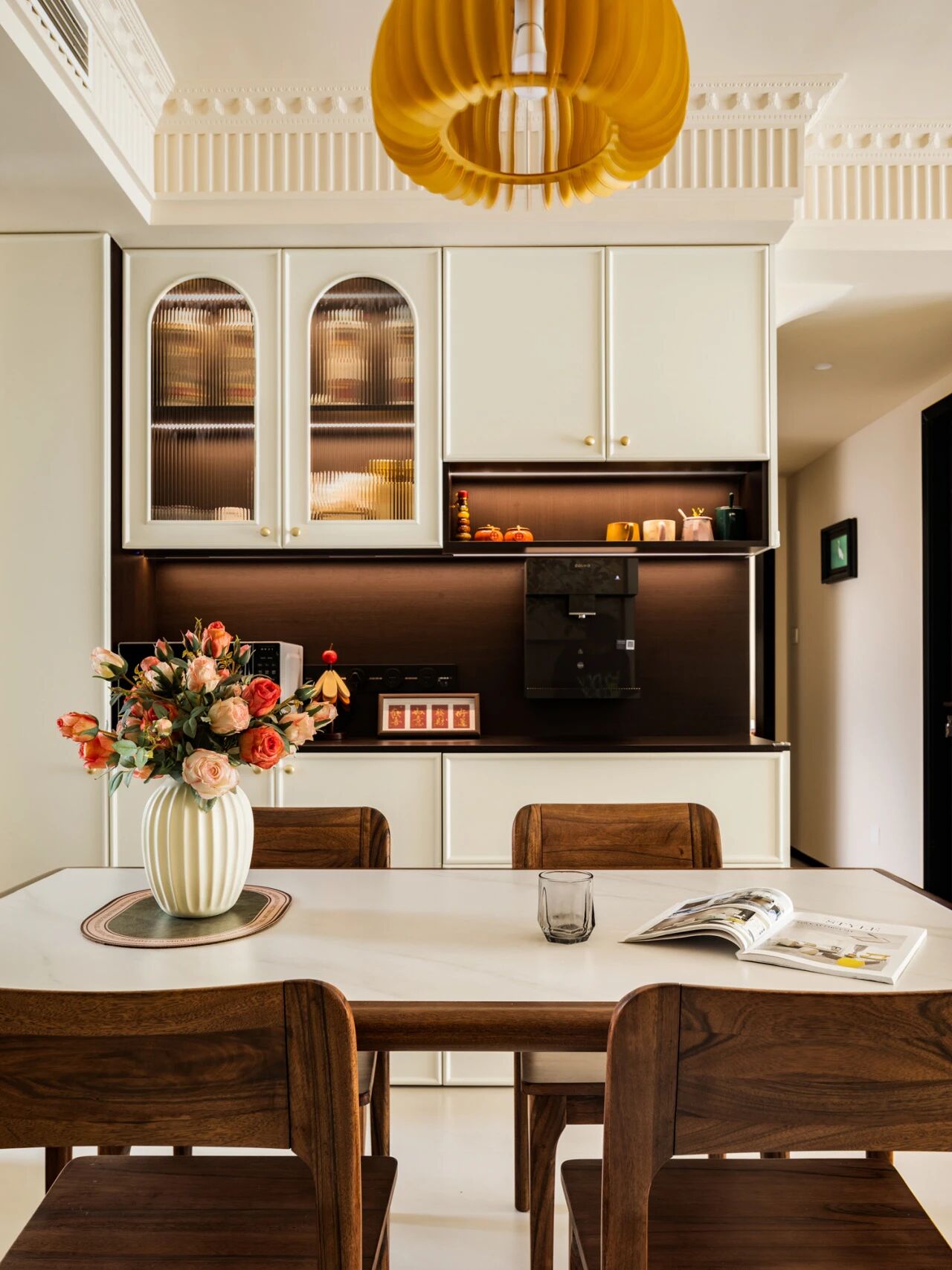 毕竟生活中好打理的岩板餐桌比易渗油渗污还笨重的实木更讨喜,全屋瓷砖通铺比易开裂的艺术漆墙地面更好打理……