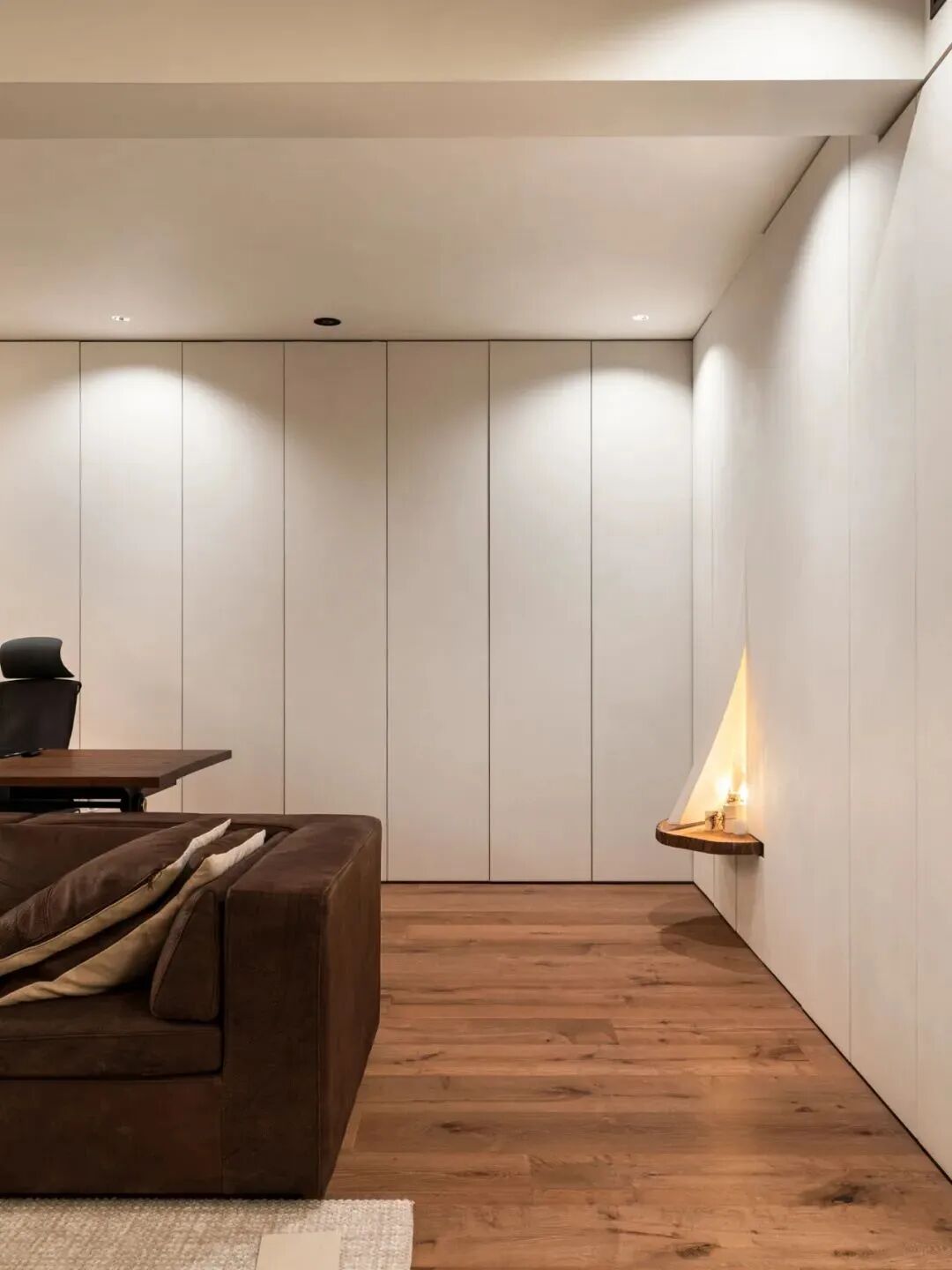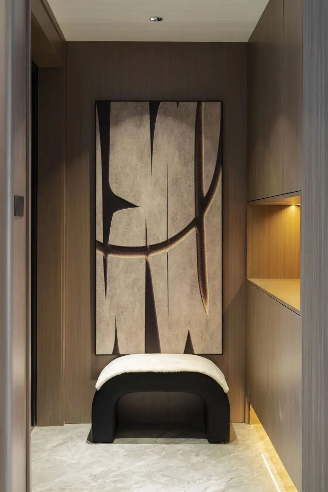 同时,在玄关柜内部嵌入灯线,作为局部照明,方便寻找鞋子和物品。
