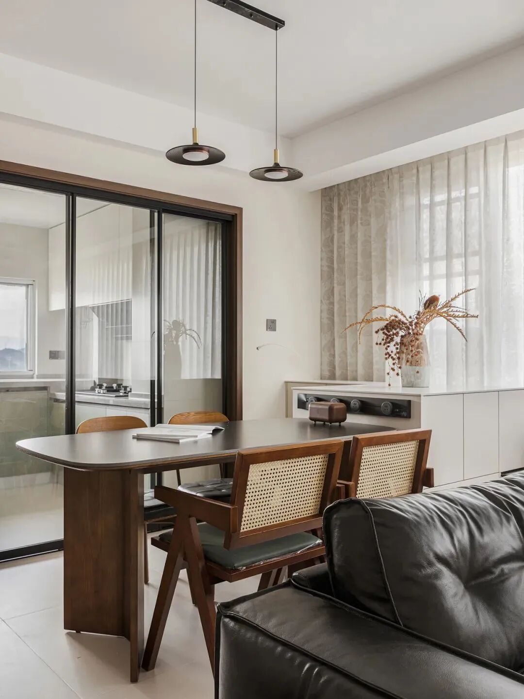 吊灯的款式可以根据餐厅的装修风格进行选择,长条型吊灯适合长桌,圆形小吊灯适合圆桌,也可以选择多盏圆形小吊灯组合使用。