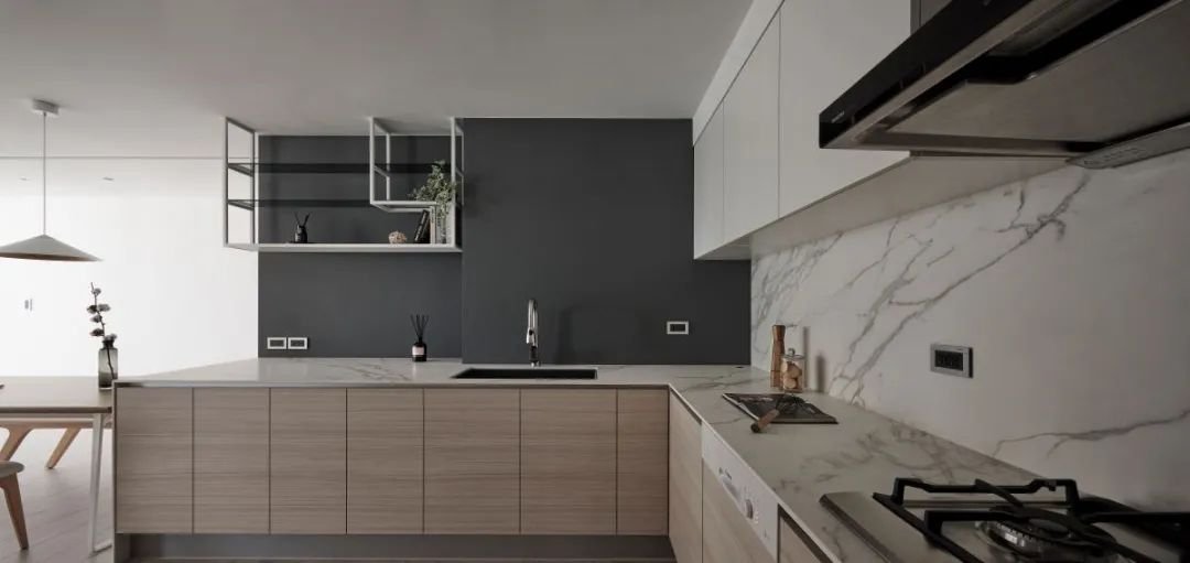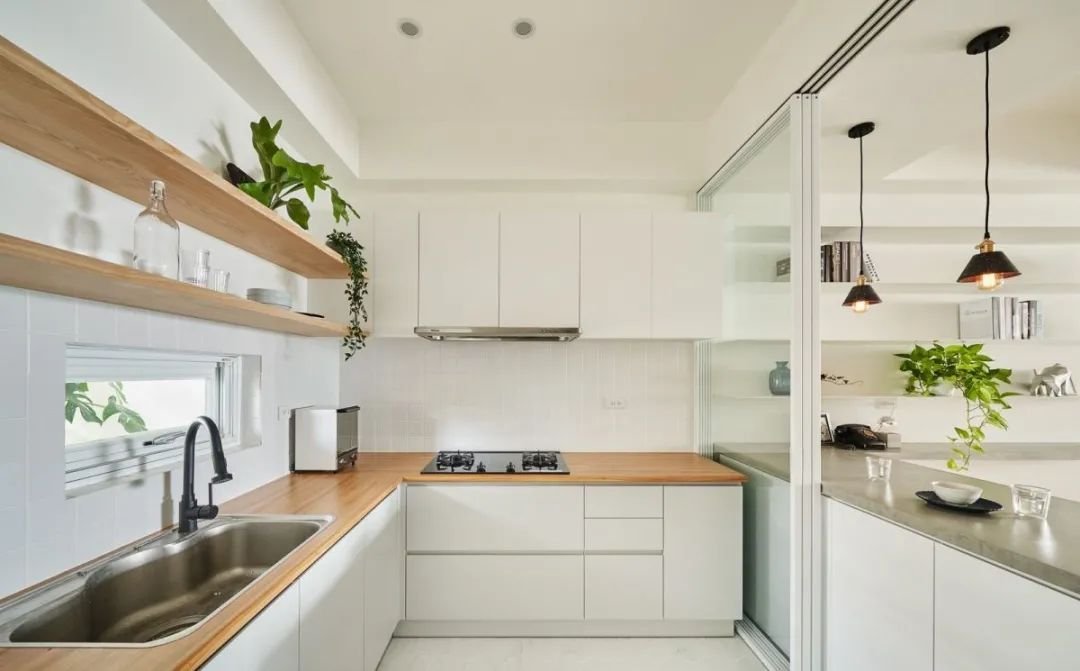 像是活用料理台面下方规划整体收纳;厨房规划上柜、天花板增加吊柜与壁挂,若是空间允许下也能增设中岛,下方可镶嵌烤箱、洗碗机等厨房电器。
